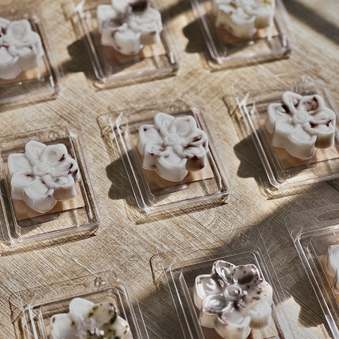Nos tablettes de cires fondantes sont fabriquées à base d'un mélange de cire de soja naturelle, crémeuse et lisse, combinée aux huiles essentielles les plus raffinées, ainsi qu'à des parfums de haute qualité.